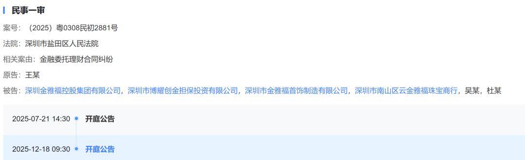 据网上报道,从今年六七月份开始已有部分产品收益延迟,根据天眼查的信息,金雅福、深圳博耀等四家公司7月份被王某就“金融委托理财合同”告上法庭: