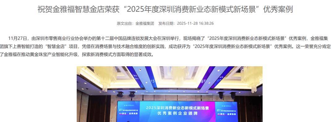 更有意思的是,金雅福官方网站在11月28日还Po出了智慧金店荣获消费新业态新模式优秀案例的获奖通知。